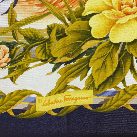 Ferragamo Blue, Gold, & Multicolor Birds Silk Scarf