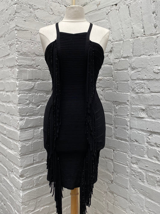 Herve Leger Black Sequin Fringe Bondage Dress, S
