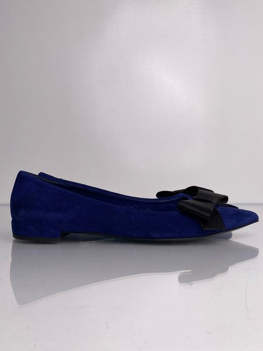Prada Pointed Toe Blue Suede Bow Flats, 39.5