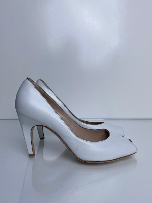 Salvatore Ferragamo White Leather Peep Toe Heels, 7.5