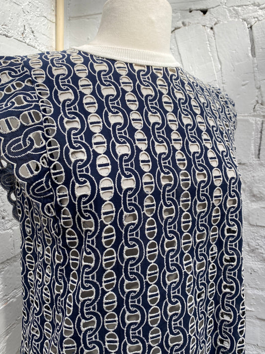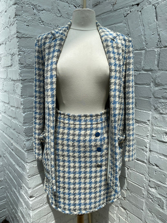 Sandro Cream, Blue & Gray Houndstooth Tweed Blazer & Skirt Set, 36