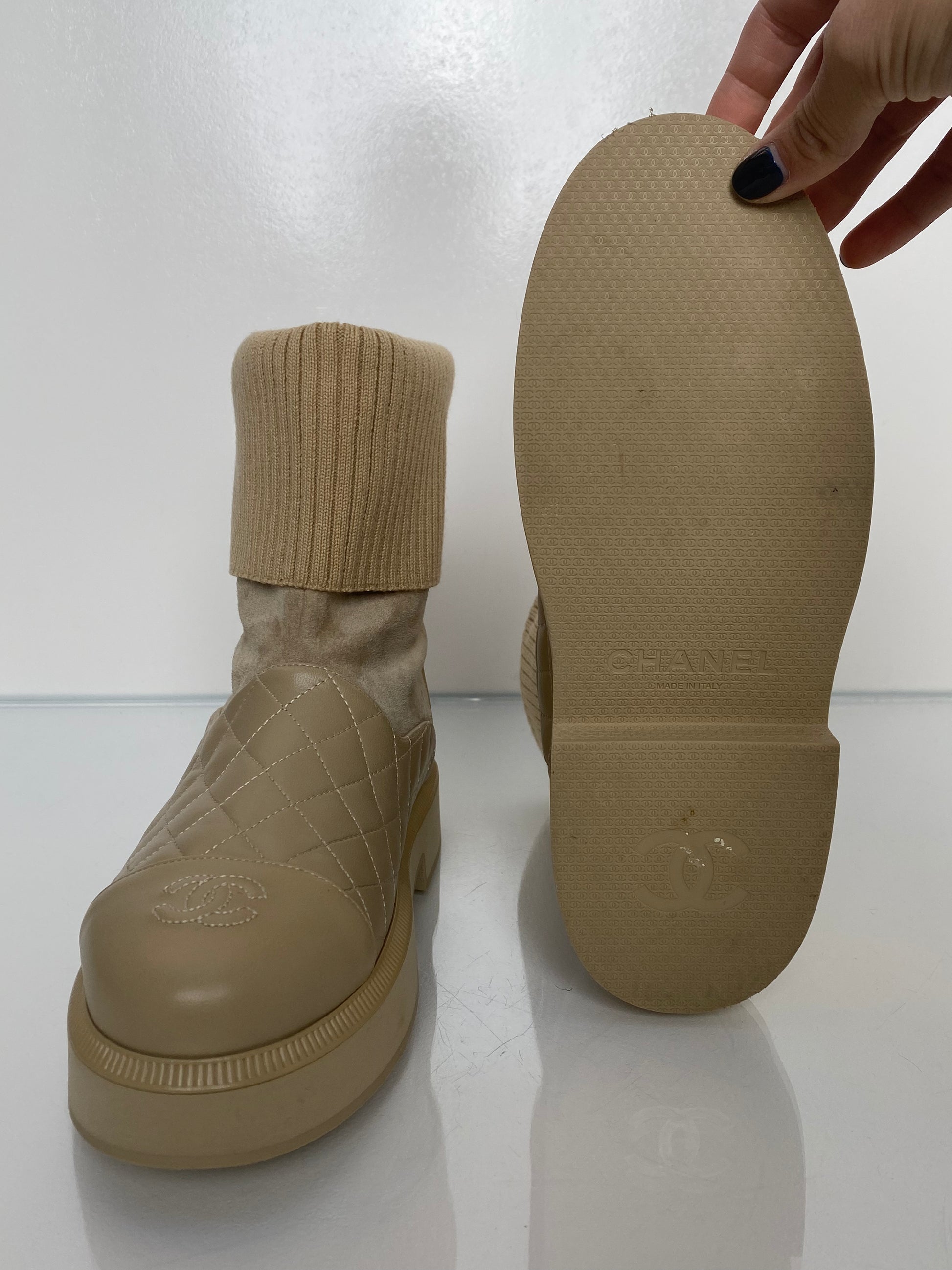 Chanel Beige Knit Quilted Lambskin & Suede Boots, 8