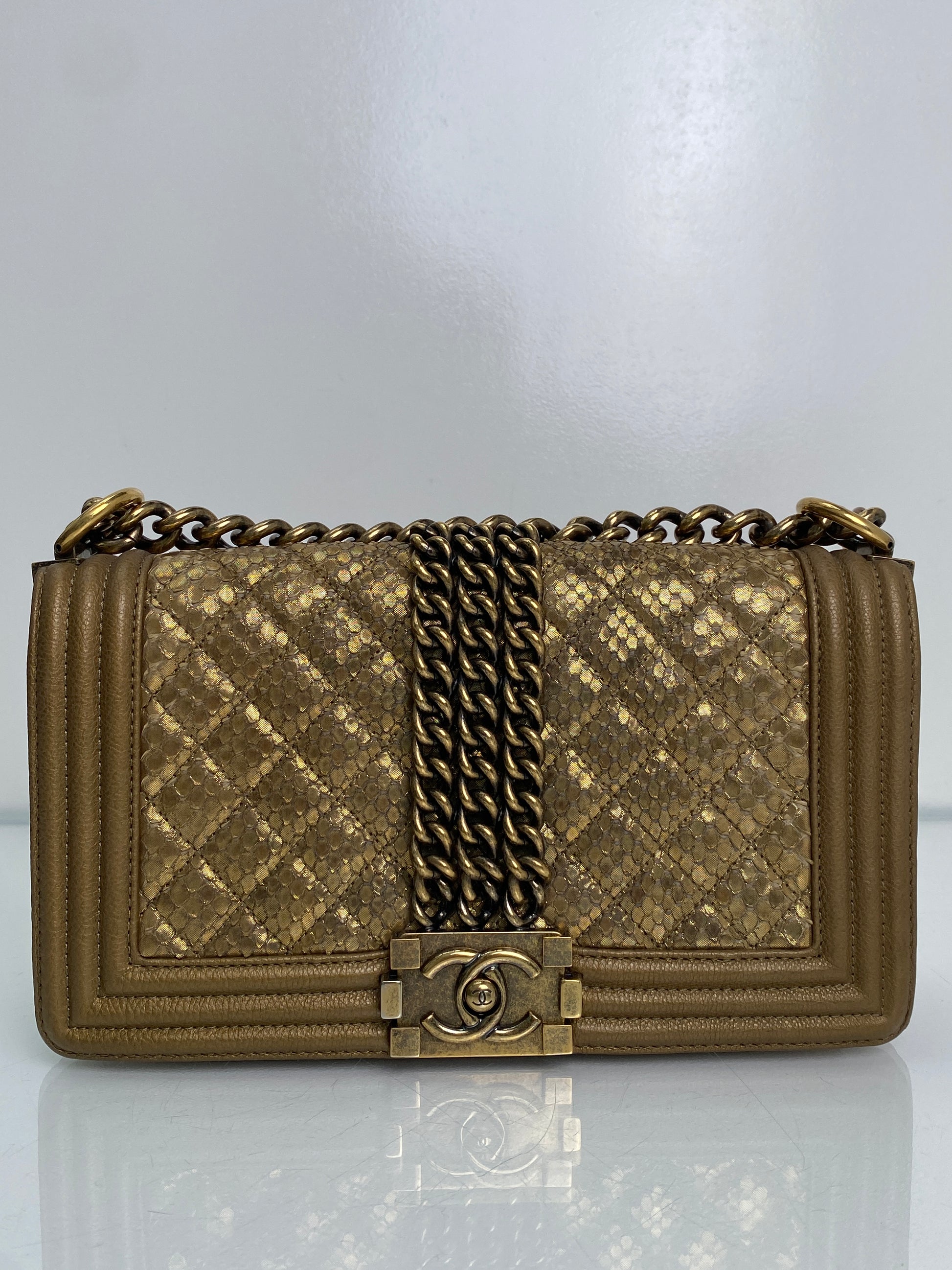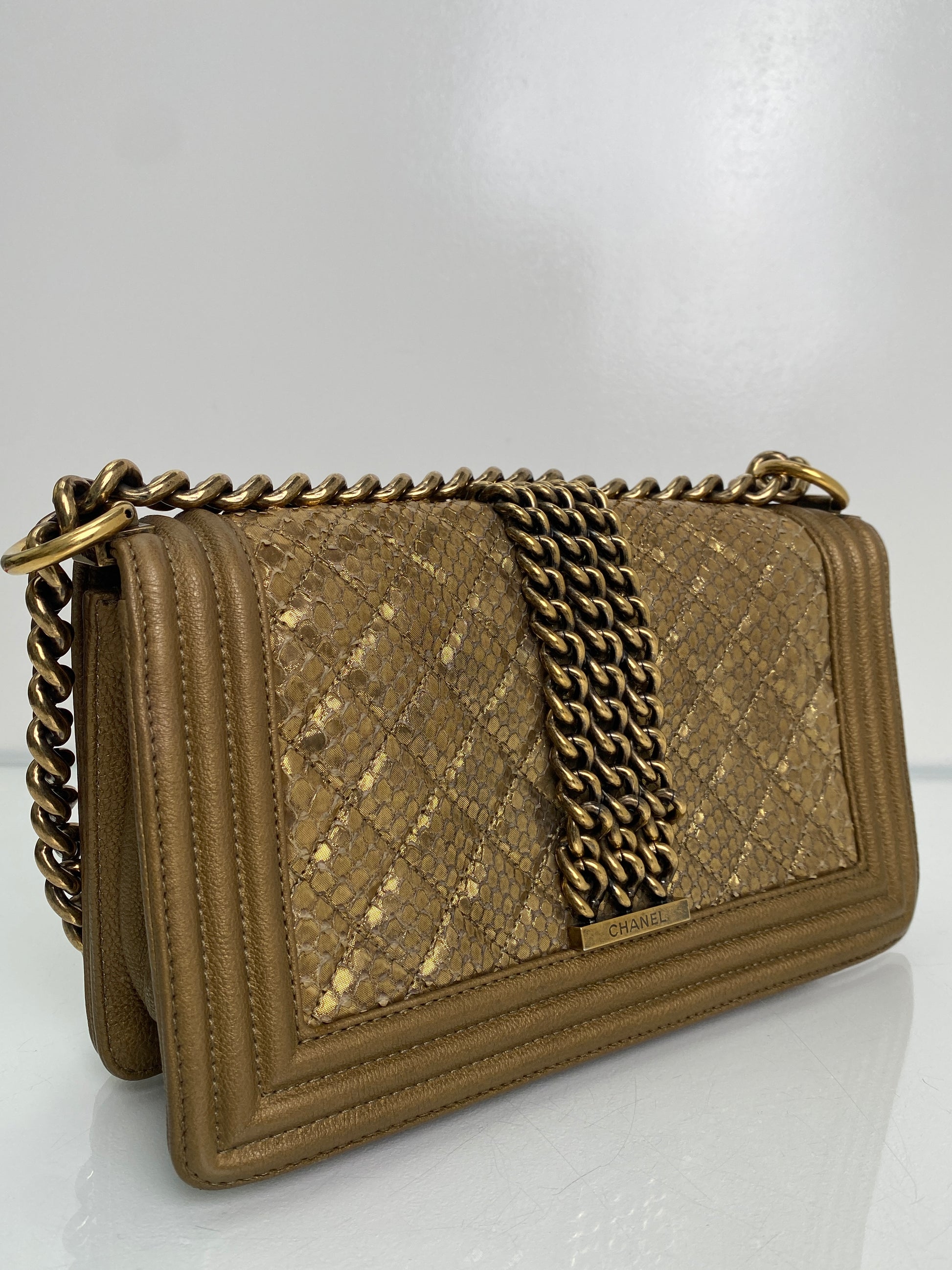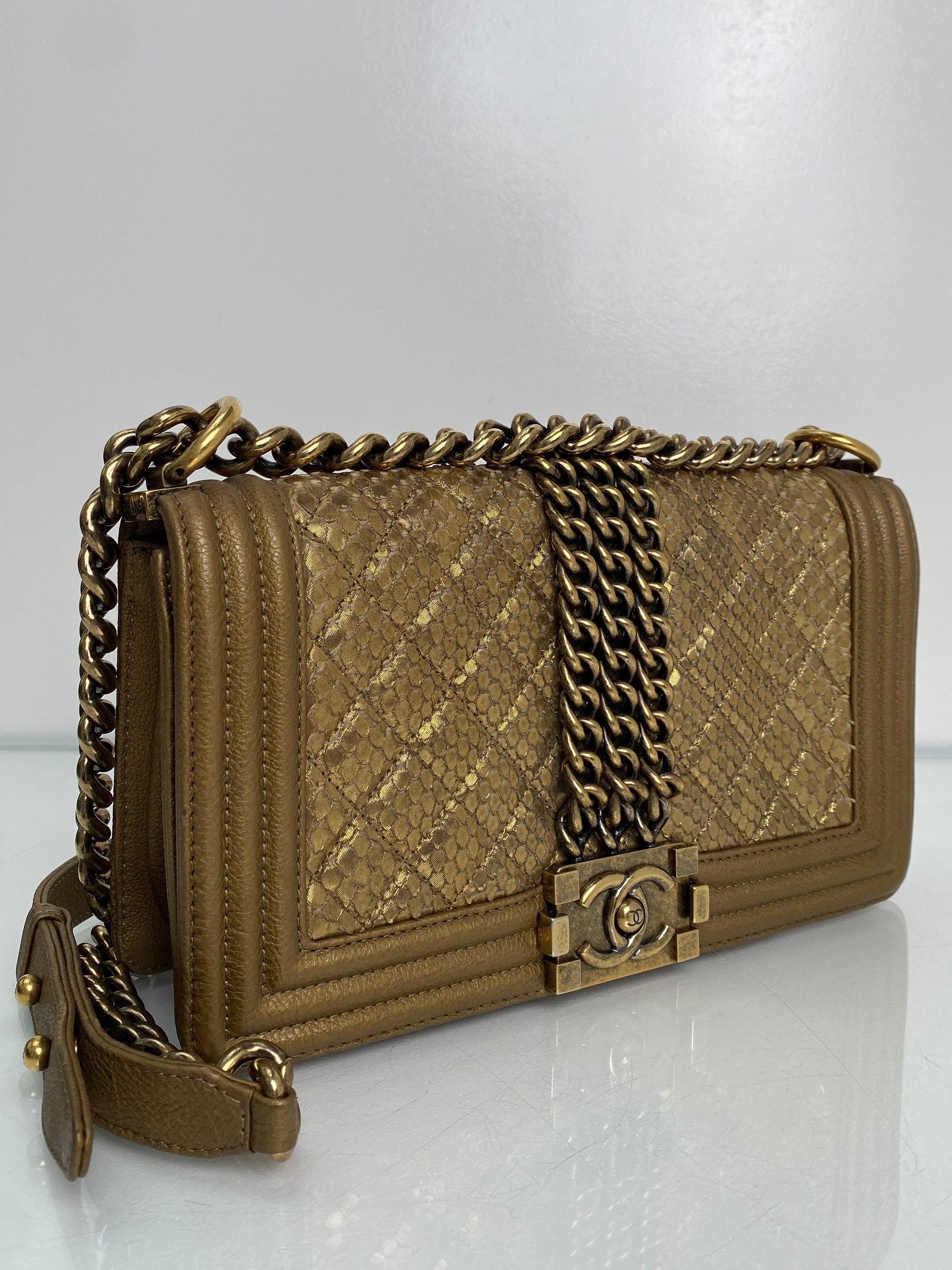 Chanel Gold Snakeskin Embossed Small Chain Boy Flap Bag GHW
