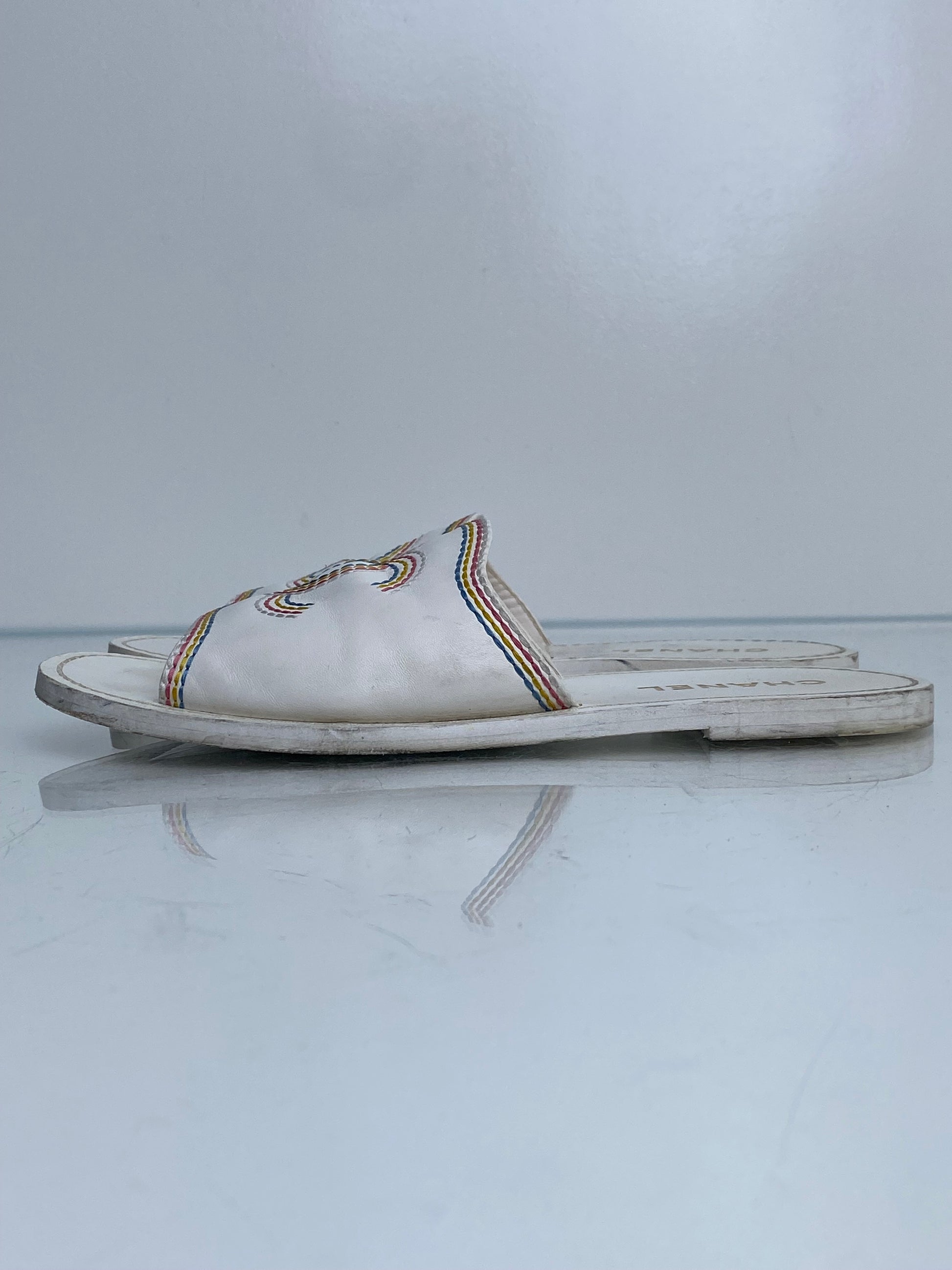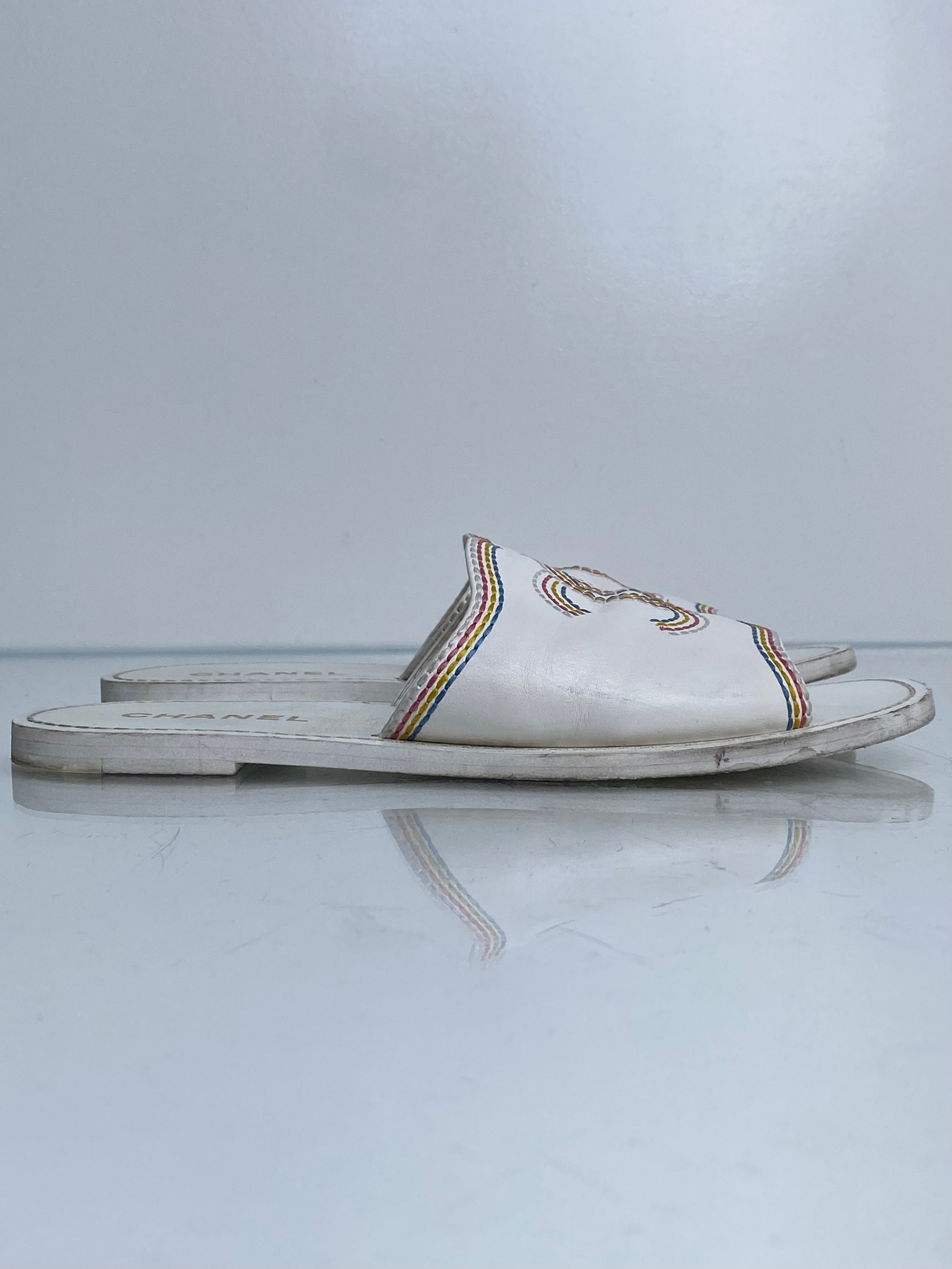 Chanel White & Multicolor Embroidered CC Sandals, 39.5 (As Is)