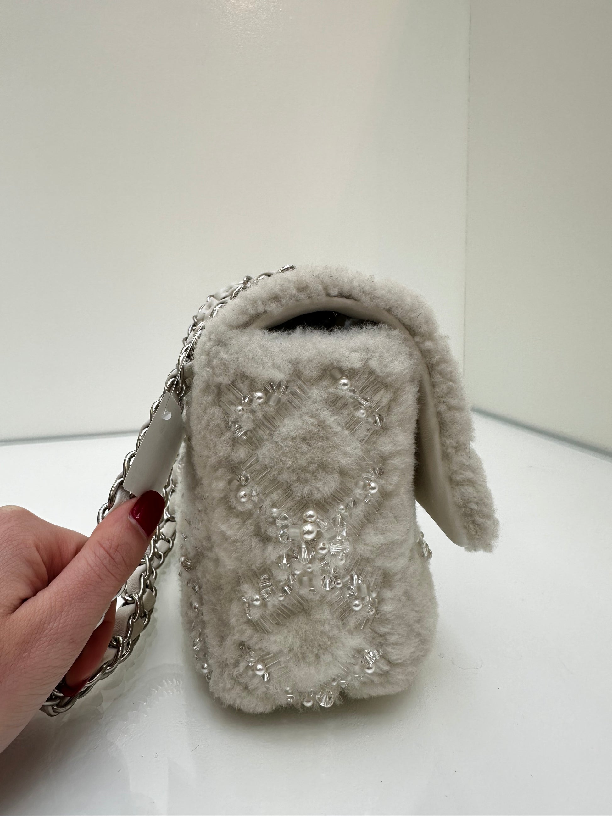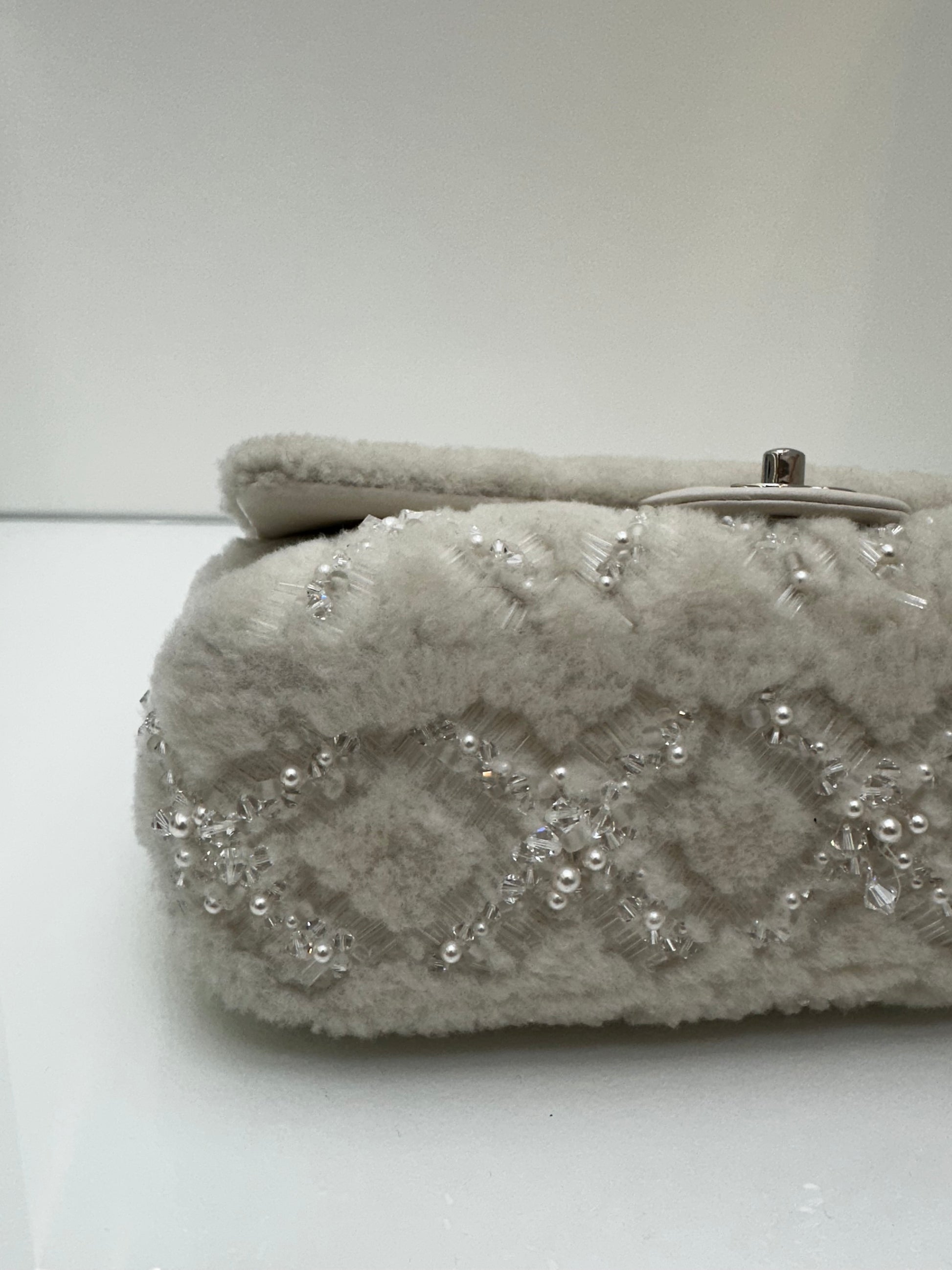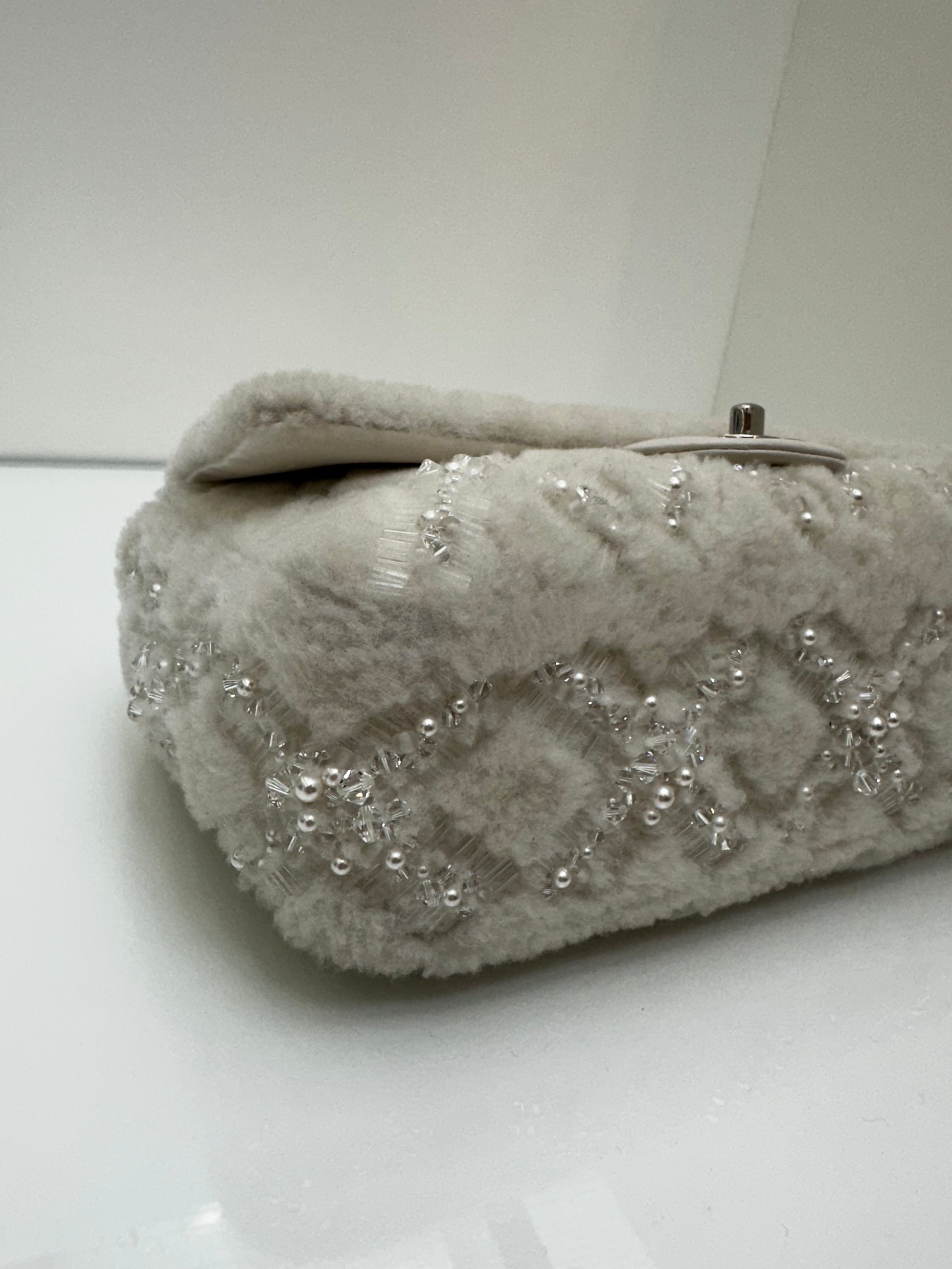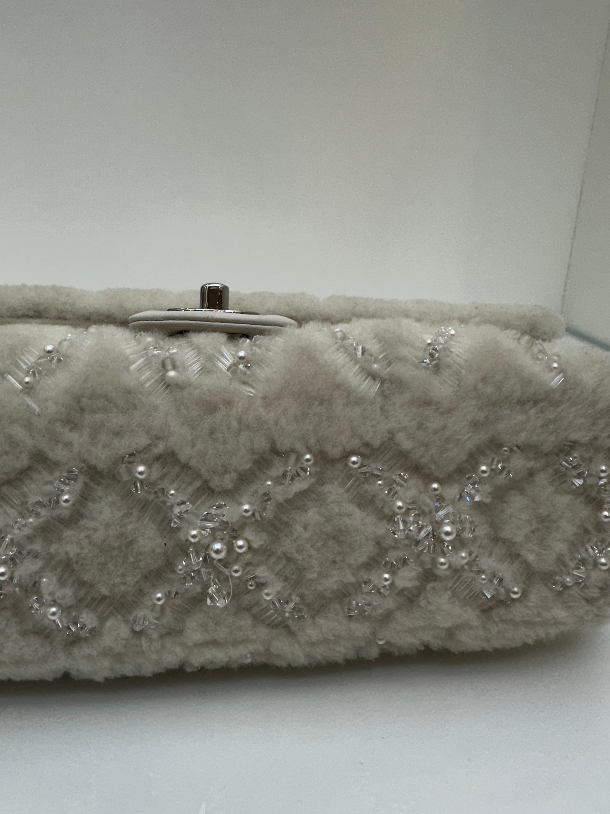 Chanel White Shearling Sequin & Pearl Medium Single Classic Flap SHW