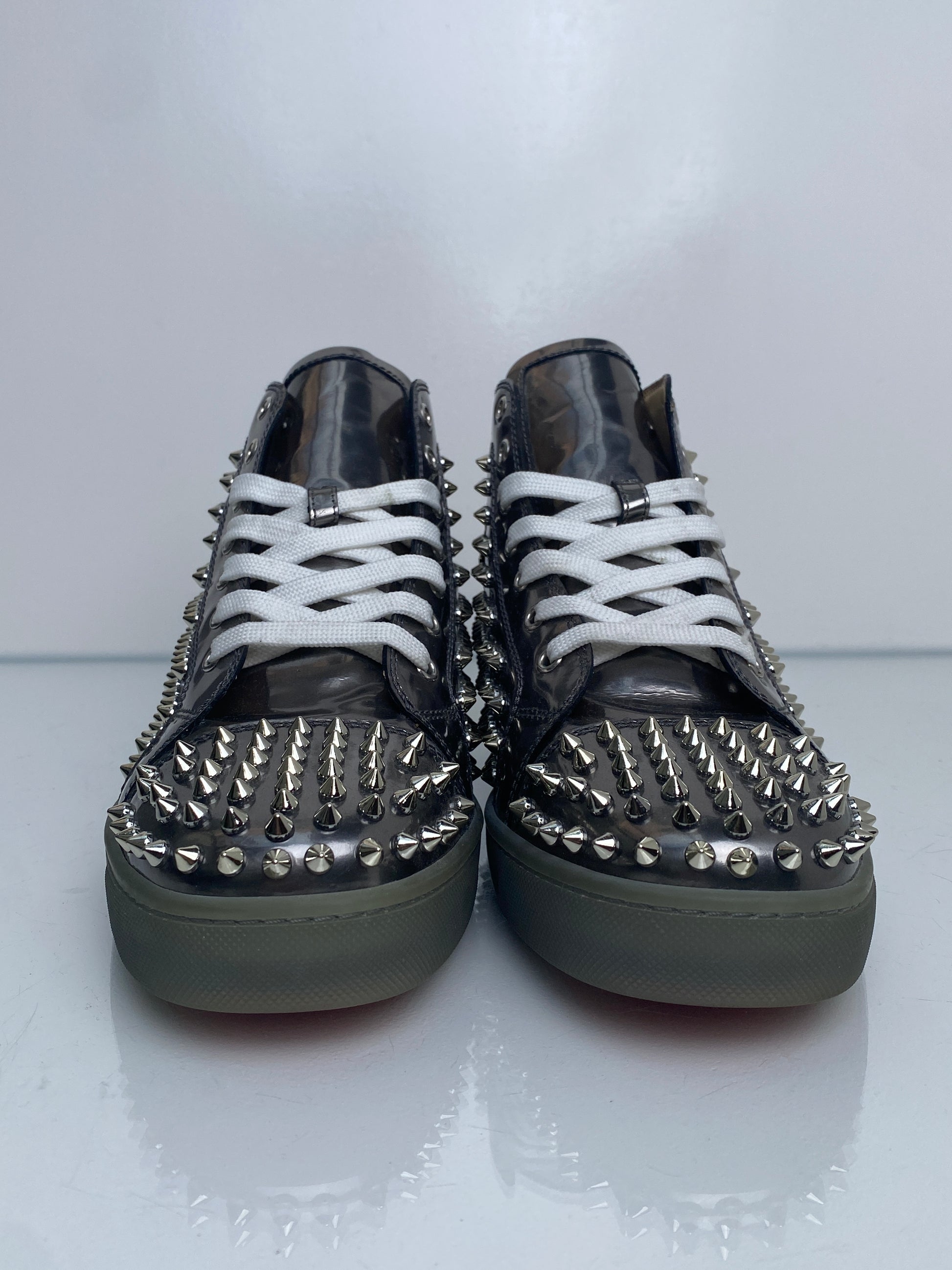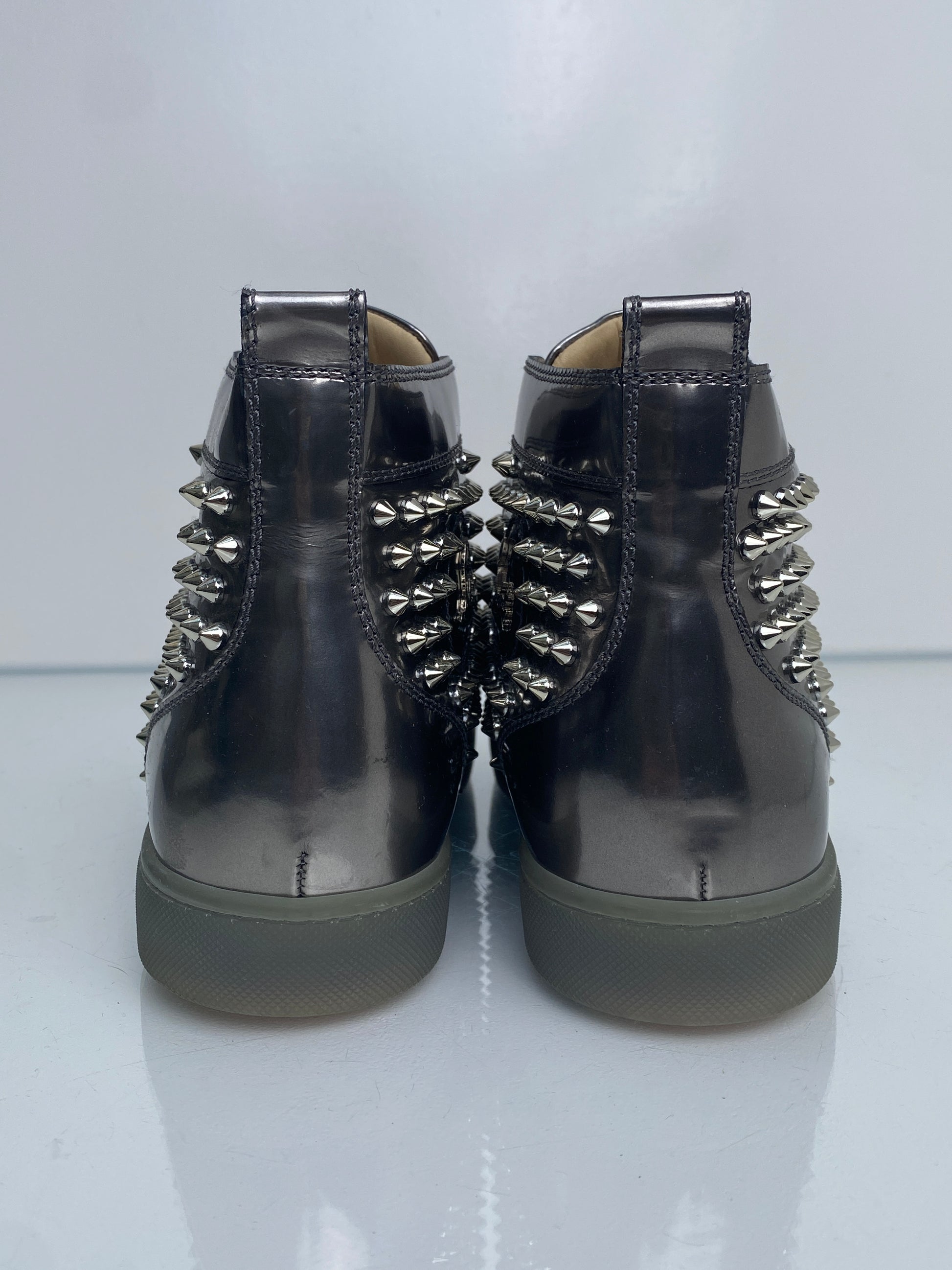 Christian Louboutin Metallic Silver Patent Leather Spiked High-Top Sneakers, 43