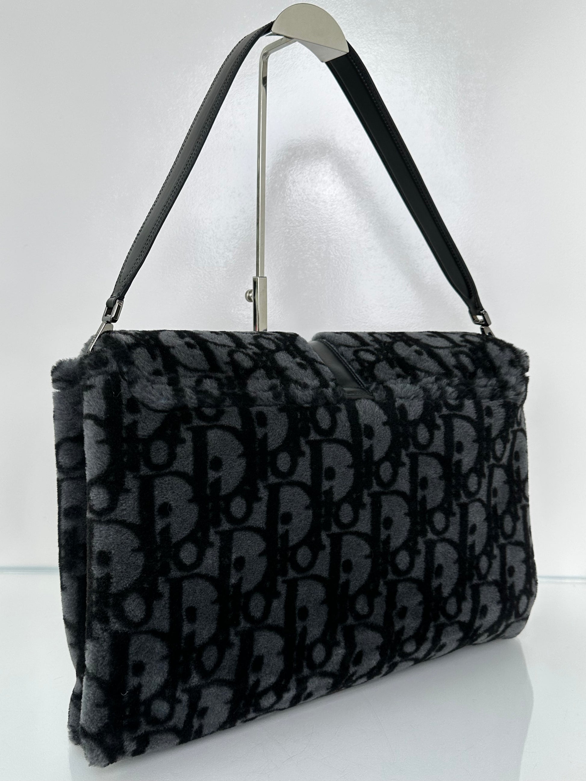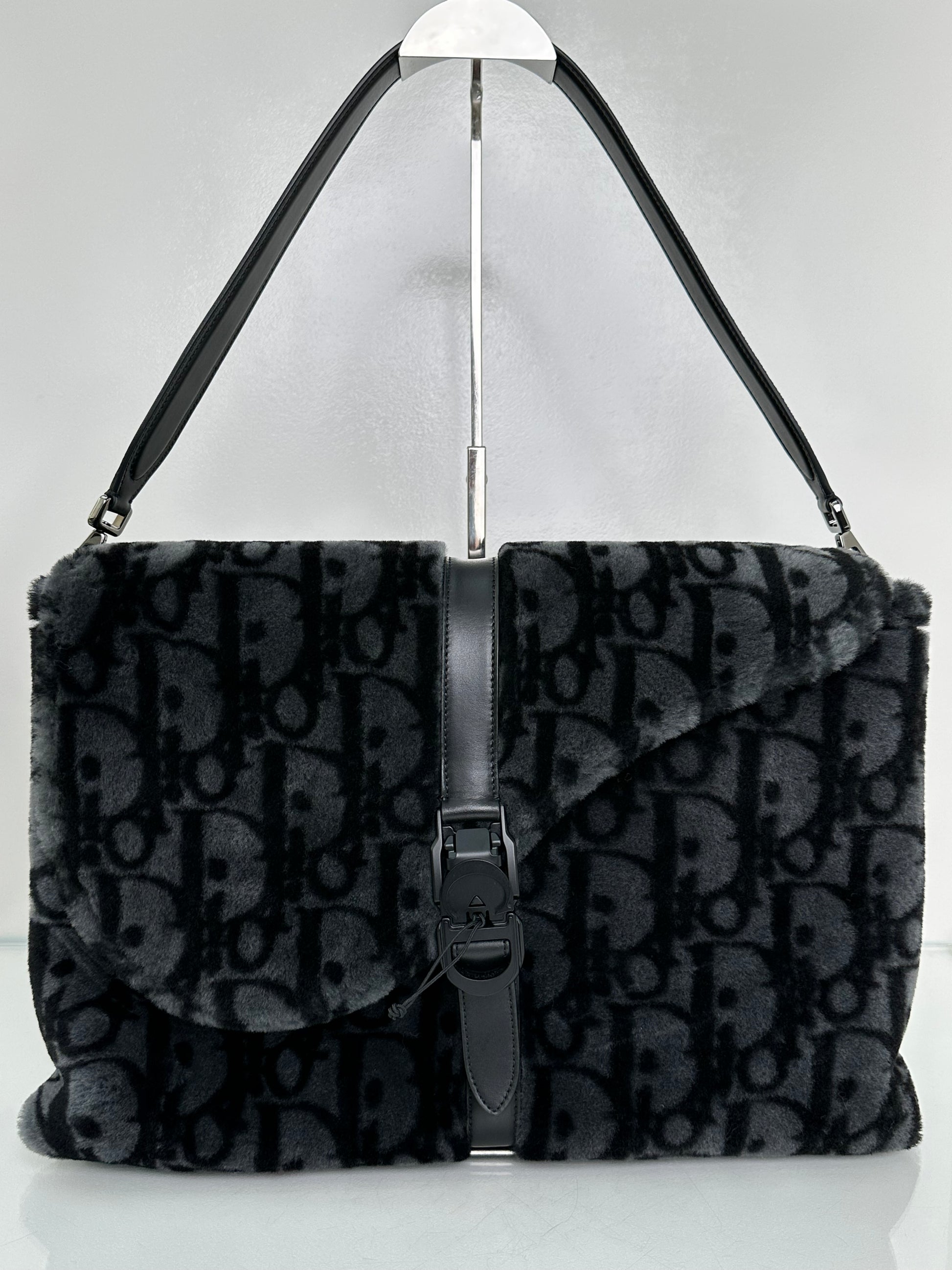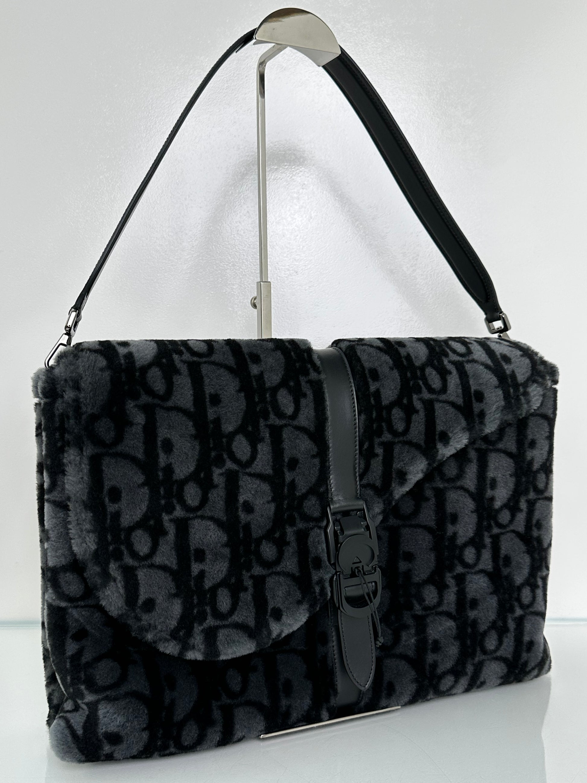 Dior Black & Dark Grey Oblique Shearling Saddle Briefcase Bag BHW