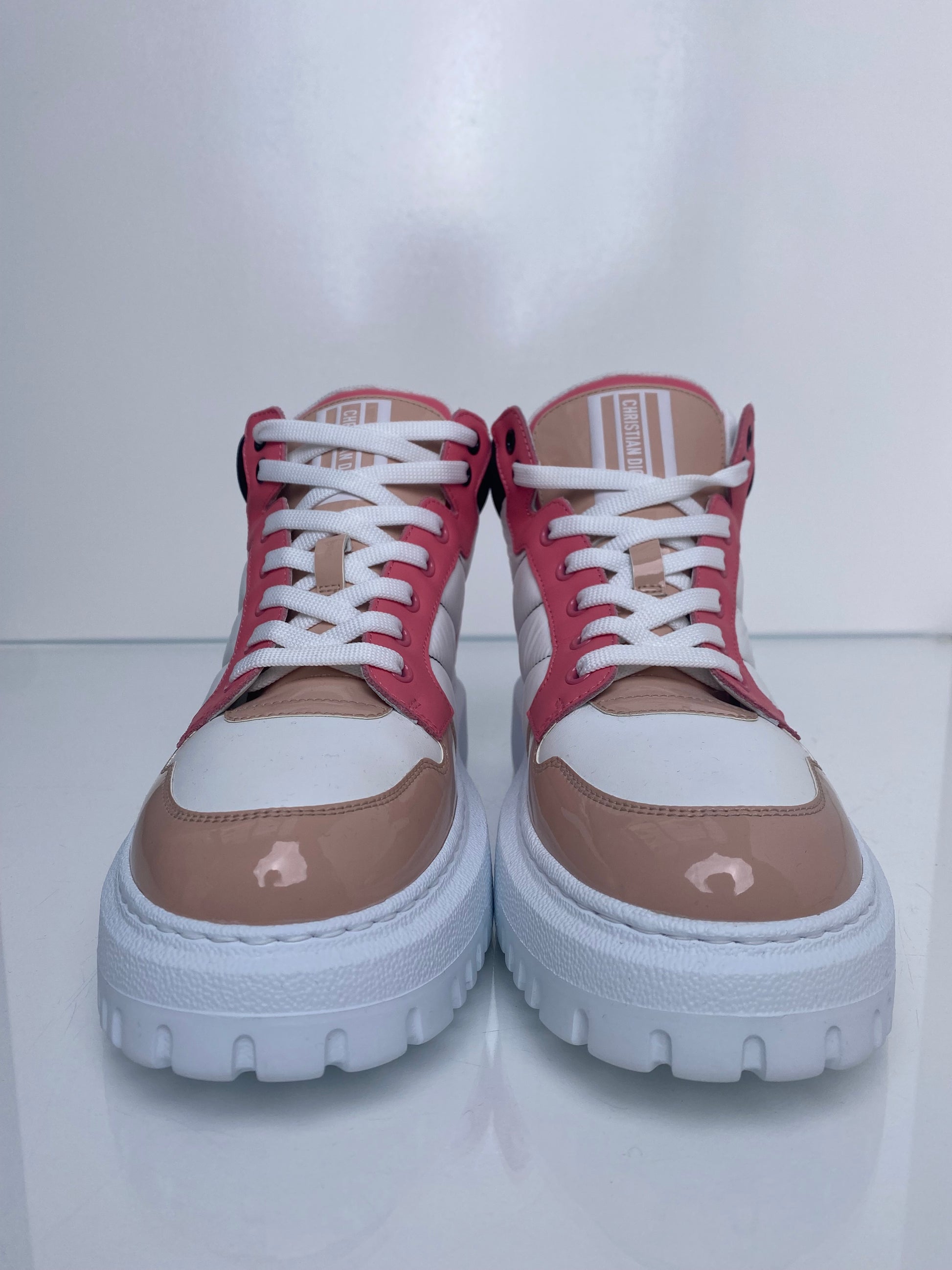 Dior White, Pink, & Tan Patent D Player High Top Sneakers, 38.5