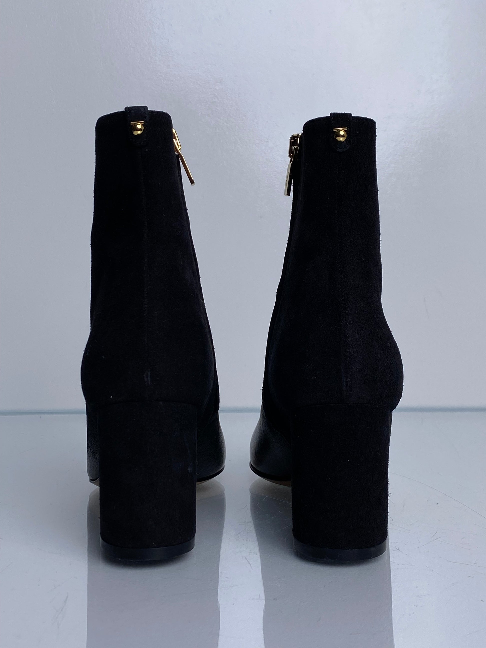 Ferragamo Black Suede To Patent Booties, 6