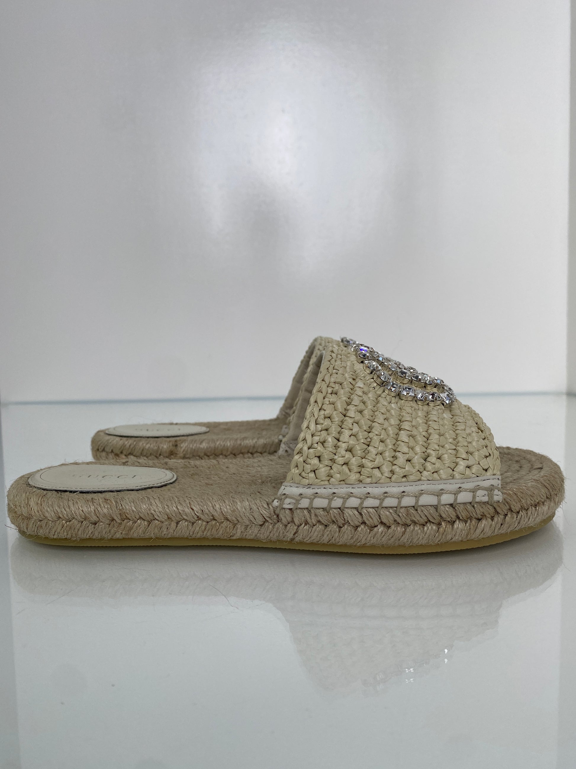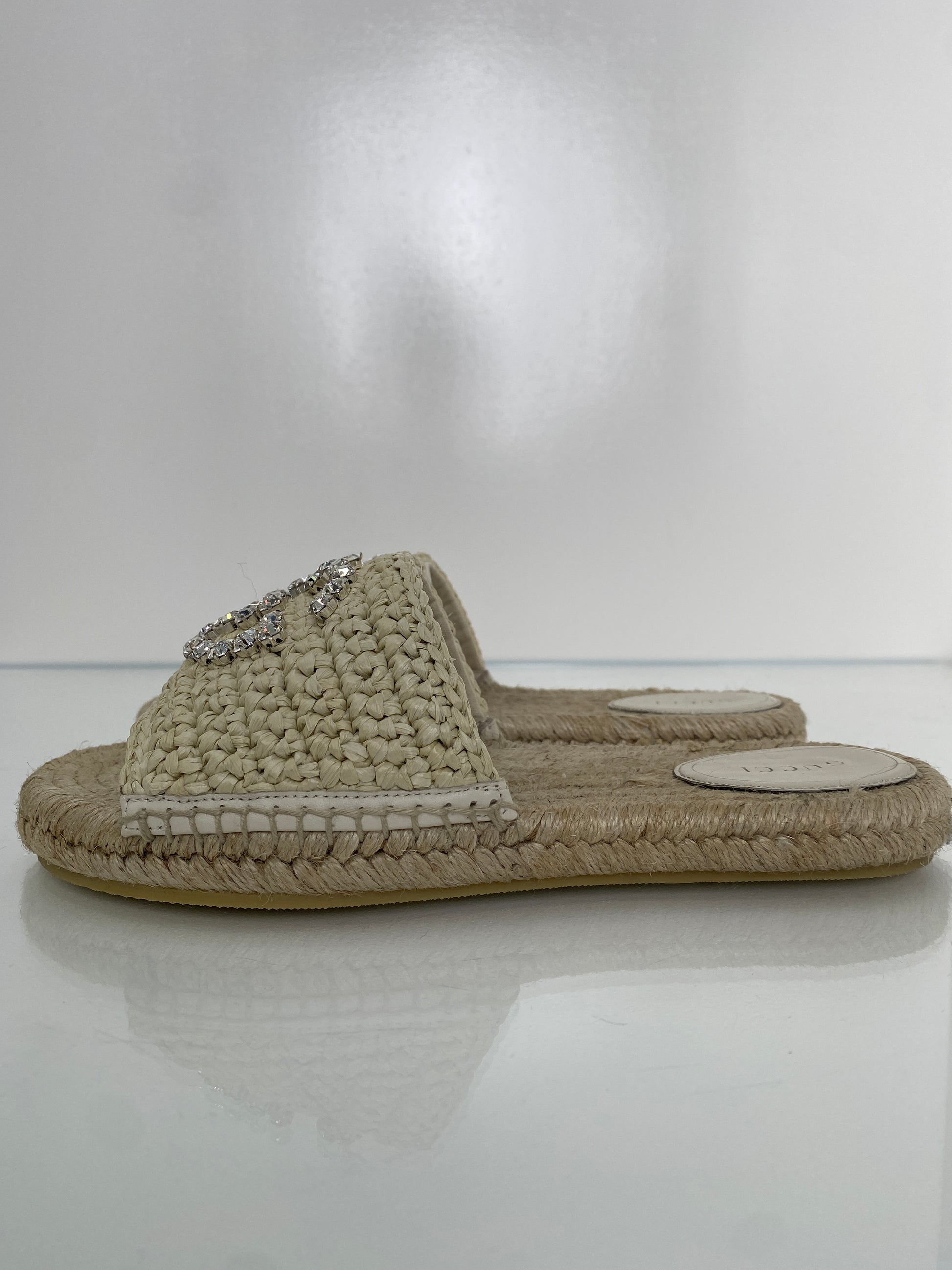 Gucci Tan & Crystal Cora Espadrille Slide Sandals, 39.5