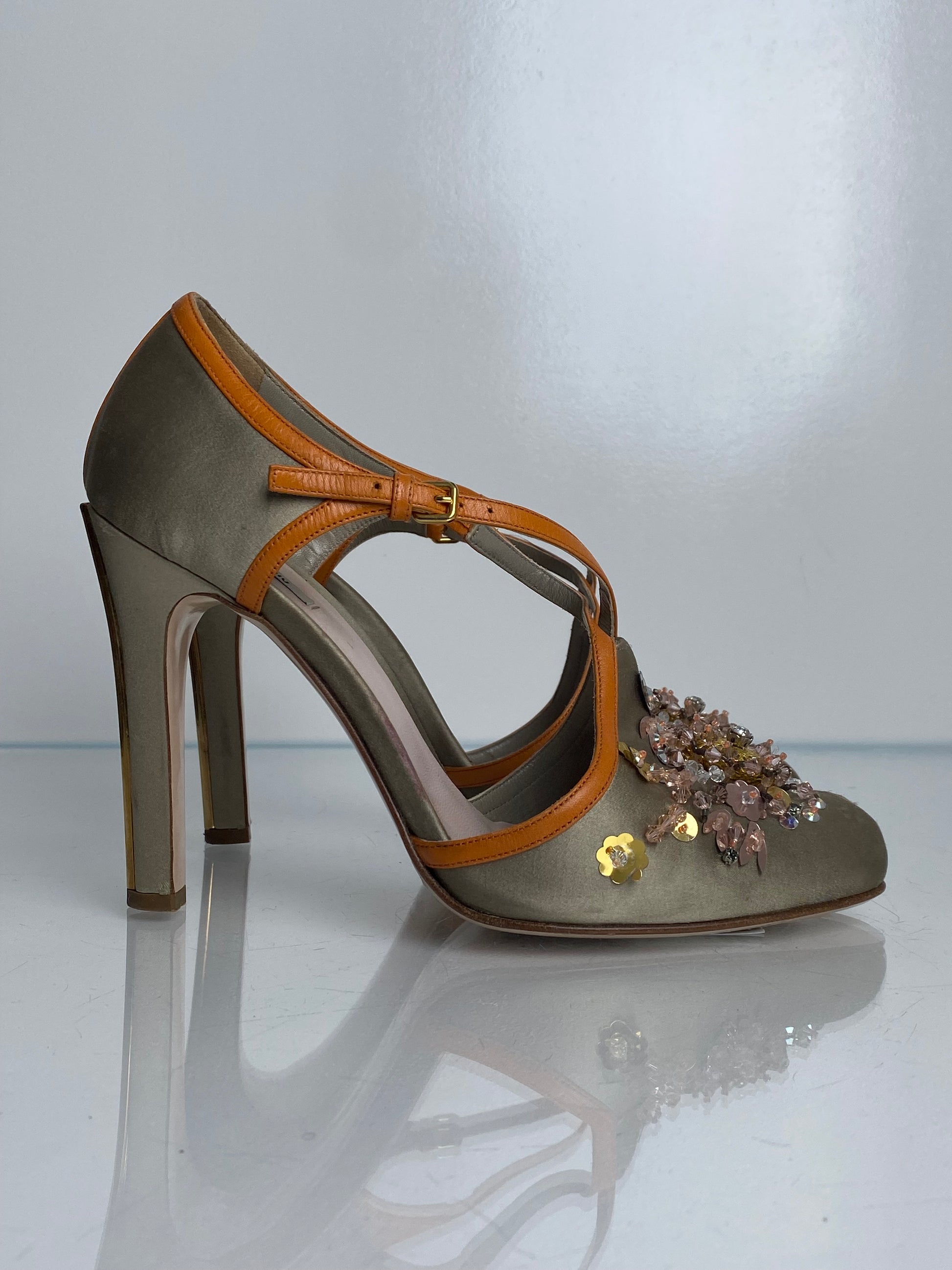 Miu Miu Grey/Orange Silk Floral Embellished Heels, 39
